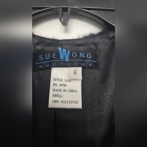 Sue Wong "Nocturne" duster coat featuring a black French ribbon appliqué and faux mink fur trim. The intricate pattern on the main body of the coat resembles a paisley or brocade design. size 6