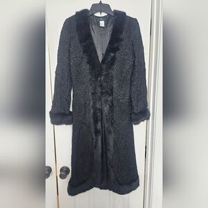 Trim: It is trimmed with plush black faux fur (described as faux mink in some listings) around the collar, down the front opening, the hem, and the cuffs.