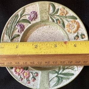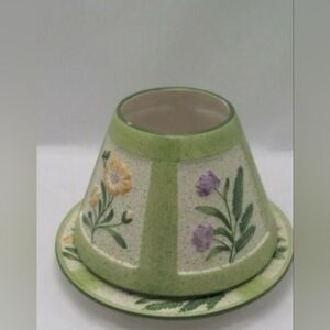 A Retired Yankee Candle 2 Piece Votive Shade Topper Plate in the "Floral Garden" or "Garden Flowers" design. This ceramic set is designed for use with a small jar or votive candle and features a hand-painted details.