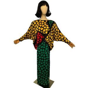 Striking vintage Guy Laroche Paris pure silk dress featuring bold geometric mosaic print in yellow, emerald green, and red on a black ground. Dramatic batwing dolman sleeves with fluid drape and an elegant column silhouette that moves beautifully on the body. High fashion Parisian design with an art-deco-meets-80s statement aesthetic. Lightweight silk crepe feel with rich saturated color and signature designer construction. Back slit at neckline for easy wear. A rare couture-era Guy Laroche piece perfect for collectors, editorial styling, and bold statement dressing.