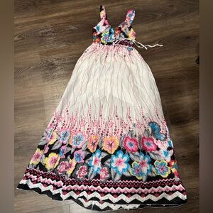 Chic dress with a white base and pink patterns. Perfect for any occasion. 100%cotton. 3 decorative buttons at the front. Lined. Length from the waistline about 36”. Super light, glows, elegant and cute. New!