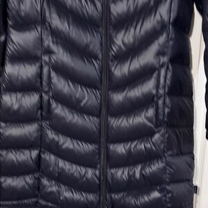 Elegant dark blue puffer jacket by Calvin Klein. Offers warmth and modern style.