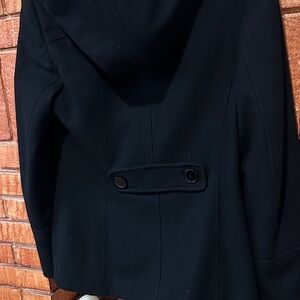 Chic double-breasted design. Perfect for versatile styling. Timeless elegance. Hooded for added warmth or protection from the elements.