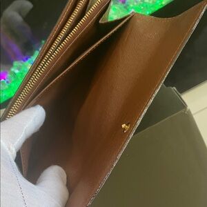 Elegant wallet with signature monogram design. Features a gold-tone snap closure. Has ten card slots total 4/6. Multiple sections with zipper pocket. Zips and snaps nicely. Older wallet but very clean given age. Perfect for a night out or everyday use.