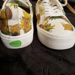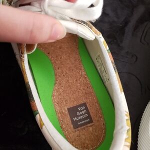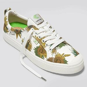 Cariuma x Van Gogh Museum Sunflowers sneaker. This limited-edition shoe, a tribute to Van Gogh's masterpiece & the museum's 50th anniversary, brings vibrant artistry to a comfortable, eco-conscious silhouette.The Cariuma x Van Gogh Museum Sunflowers sneaker merges artistic expression w/ eco-conscious materials. The shoe features a vibrant print of Van Gogh’s Sunflowers on an organic cotton canvas upper. design incorporates sustainable fts. like a durable natural rubber outsole & a comfortable, supportive insole made from a blend of cork & bio-based mamona oil foam. Finished w/ laces from recycled plastics & organic cotton, the sneaker offers style, comfort, & a subtle nod to the artist's legacy w/ his signature near the midsole.
