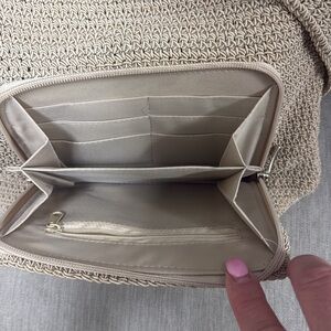 Stylish beige knit tote bag perfect for everyday use. Features a spacious interior and a convenient front pocket. Ideal for adding a touch of elegance to any outfit.