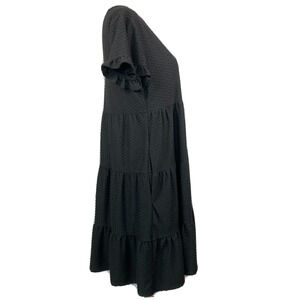 Color: Black Knit Swiss Dot Textured Short Sleeves Ruffle Sleeve Accent Round Neck Side Pockets Keyhole Hook and Eye Back Closure Tiered A Line Babydoll Style Knee Length