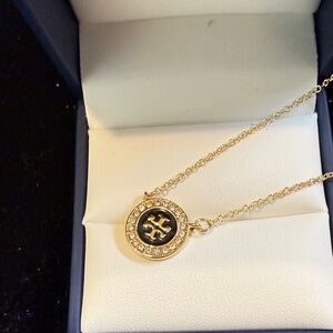 Chic necklace with a gold Tory Burch emblem. Ideal for stylish elegance.