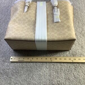 Keywords: Coach bag, Tote, Signature print, Beige, Chalk, Shoulder bag, Everyday bag, Work bag, Travel bag, New with tags, Designer handbag, Fashionable, Spacious