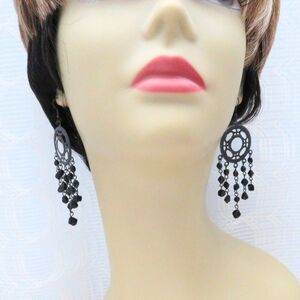 Transform your look with our exquisite Black Chandelier Earrings that effortlessly blend boho charm with modern flair. These stunning lightweight earrings feature round, metallic intricately designed pendants adorned with beautiful beaded dangles that sway gracefully as you move. At 3 3/4 inches long and 1 1/4 inches wide, they make a striking statement without overwhelming your outfit.