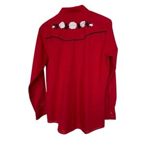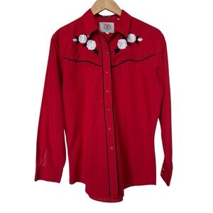 Vintage 1990s Ely Country Charmers Wild Rose women’s western button-up shirt in size L (regular fit). Red solid color with a collared neckline, long sleeves, pearl snap front closure, and snap cuffs. 65% polyester and 35% cotton with black piped trim and white rose embroidery accents. Suitable for casual wear or party/cocktail occasions. Condition: pre-owned. Small area of staining on bottom see photos for details.