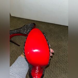 Black and silver mesh design with signature red soles. Perfect for a stylish statement. These were a gift, too small so I didn’t wear them but I displayed them in my closet. I no longer have the box. Make an offer!