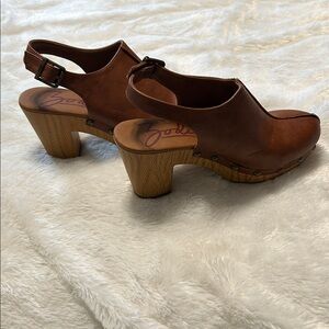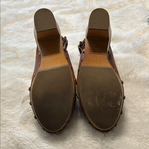 Step out in style with these chic brown leather clogs. Studded. Sling back adjustable strap. In excellent condition. Only worn once or twice. Faux wood heel.