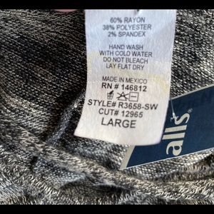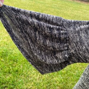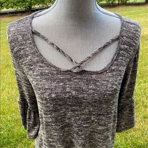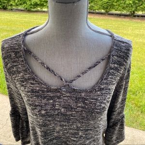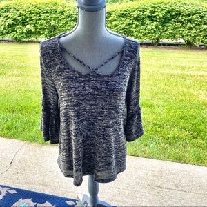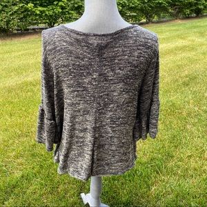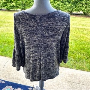 Women's charcoal gray top. Cross scoop neckline, pullover knit pattern, soft & stretchy with 3/4 ruffle bell sleeves