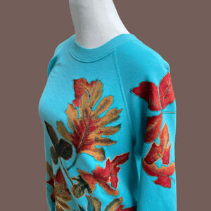 Vibrant and artful, this vintage Hanes crewneck features a rich aqua blue base adorned with hand-painted and piped fall leaves across the front and sleeve. Cozy fleece-lined interior, ribbed cuffs and hem, and an easy pullover fit. A rare handmade gem that leans cottagecore meets folk art fashion. ✧ peak thrifted cozy energy