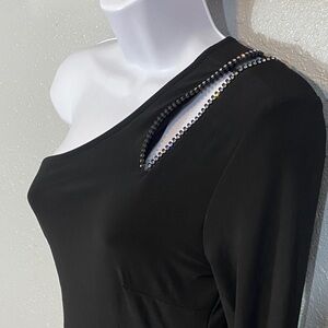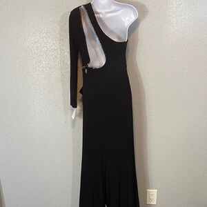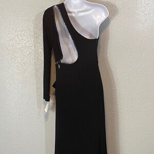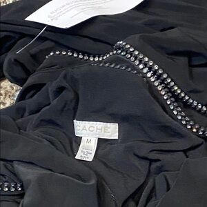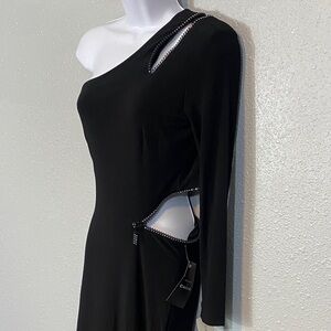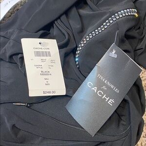NWT. Cache Tina Knowles dress. This stunning black one-shoulder dress features elegant rhinestones zipper cut out, zipper is functional. Perfect for any special occasion. Its sleek design offers a sophisticated look. Size medium. Does stretch. Pit to pit 16.5”. Shoulder to hem 61”.