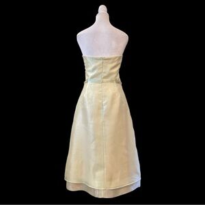 After Six strapless bridesmaid dress in very light pastel green sheer overlay over soft yellow/champagne linings. Four-layer skirt (two slips + two sheer overlays) provides elegant drape and coverage.