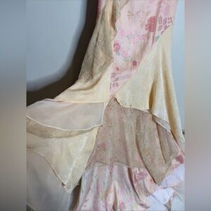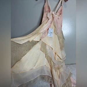 Features: Soft satin at bust, pieced together fabrication with sheer chiffon and lace detailing, textured jacquard paneling, ruffled detail throughout body, asymmetric hemline, adjustable tie at back