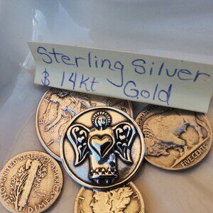 A solid sterling silver and 14kt gold angel token. This token features an angel in S.S holding a 14kt yellow gold heart. 6 grams total weight with 1/2 gram being 14kt gold. Marked 925/14kt. In fine condition. Minimal tarnish.