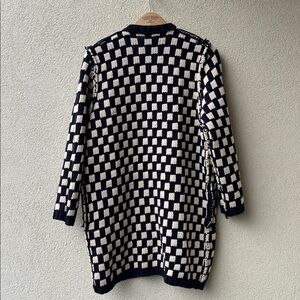 Unknown fabric or size - listing as a medium as that corresponds to some other sweaters I have. This is a chunky knit long cardigan (or "coatigan") in a navy and cream checked pattern. Large snap button closure. Previous pocket seams have been sewed shut to remove bulk. Shown reverse as this can be worn either way if you're feeling light or dark more.