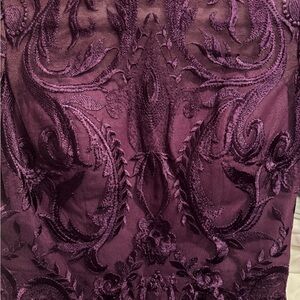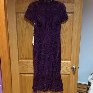 Chic and stylish midi dress. Features intricate lace design. Ideal for elegant occasions. Color Grape. Size 2. BNWT