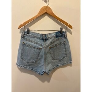 Abercrombie Fitch The Mom Short high rise denim shorts in a light wash. Distressed detailing on the right pocket adds a touch of edge. These shorts are perfect for casual outings or a relaxed weekend.