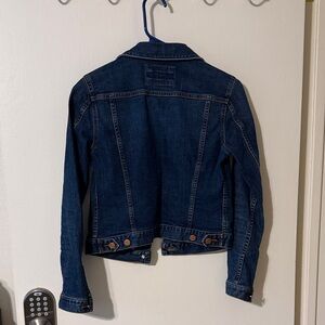 Stylish denim jacket featuring copper buttons. Perfect for casual wear. Jacket is fitted, and slightly cropped. Hits at the waist.