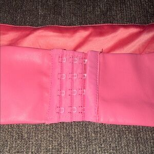 Chic bright pink faux leather bra/crop top. Features elegant design and smooth texture.