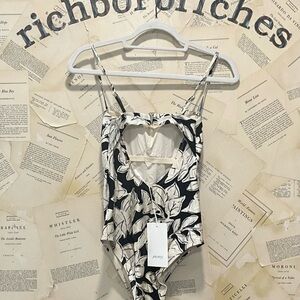 Free People Peony Strapless Printed 1 Piece Swimsuit Duet Ivory Black Leaves