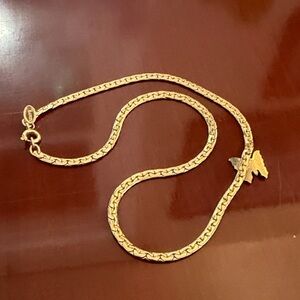 This elegant gold necklace features a stunning butterfly design with vibrant green accents. Perfect for adding a touch of nature-inspired beauty to any outfit.