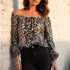 Elegant blouse with a navy and cream abstract pattern. Features long sleeves and a relaxed fit.