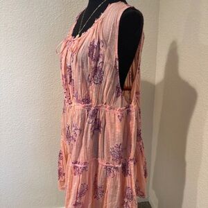 Vibrant coral mini dress with floral accents. Sleeveless and flowy. Ideal for summer days.