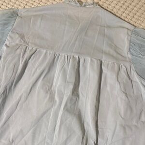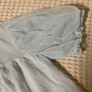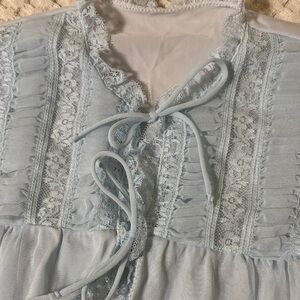 Charming light blue tie cover top with delicate lace details. Vintage lingerie. Can be worn for really any occasion. Perfect to dress up or down. Can be worn with something more formal or casual with jeans. Sheer, sexy, dainty and feminine. Very good gently used condition probably from the 1960’s or 1970’s. One small stain on front. Beautiful unique vintage piece.