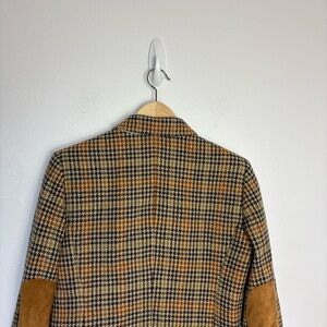 Stylish J. Crew blazer with a tan houndstooth pattern with leather elbow patches. It’s an amazing vintage piece!