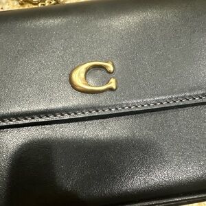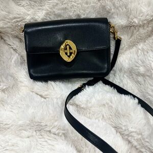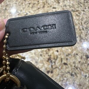 Sleek black leather crossbody by Coach. Features a stylish gold accent. Perfect for any outfit.