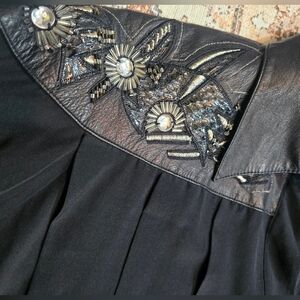 along shoulder and back is beautiful embellishment, rodeo western inspired, with leather, silver beads, sequins, and authentic snakeskin