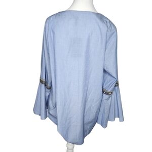 Elegant blue V-neck top with gorgeous bell sleeves with beading. Perfect for any occasion.