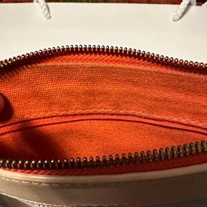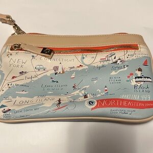 Explore in style with this chic clutch featuring a unique map print. The beige and blue design adds a touch of elegance to any outfit. In very good condition. Some discoloration in interior. See pics.