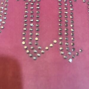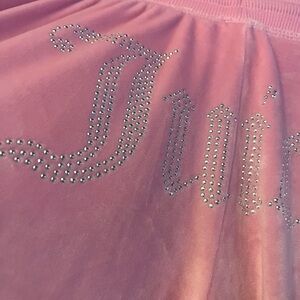 Soft pink velour top and wide leg bottoms with pockets and thick waist band with ties. Features rhinestone 'Juicy' on shirt frint and back of pants. This set has pajamas on the tag but this is a loungewear set and you could wear this as an outfit outside of the house - not just pajamas. Adorable! Perfect condition. No cuffs on sleeves.