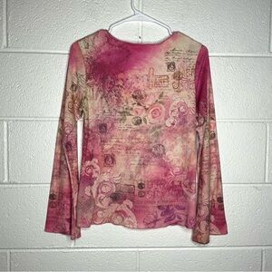 < Y2K Pink Bell Sleeve Embellished Graphic Top >