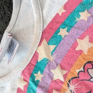 My Little Pony Friendship is Magic Dress featuring Pinkie Pie, Rarity, and Rainbow Dash glitter and rainbow graphic print with fun tulle twirl tutu skirt. Perfect for fans of the Mane 6! Well loved with some pilling and minor stains. some damage to the tulle skirt in a couple spots as pictured. Still lots of wear left and perfect for playtime.