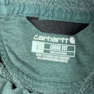 Dark green Carhartt hoodie. Yellow logo on the sleeve. Comfortable and stylish. Loose fit