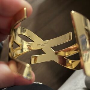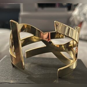 Bold gold cuff bracelet with YSL letters wrapped together like scrollwork. Perfect for adding a statement to any outfit. Can adjust to fit your wrist. EUC. Does not come with branded bag or box. Will wrap carefully.