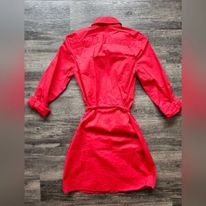Stylish red button-up shirt dress with a tie waist. Perfect for casual outings.