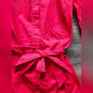 Tommy Hilfiger Polkdadot Red Button-Up Shirt Dress, great pre worn condition, micro polkadots, patriotic motif great for 4th of July celebrations, preppy, size xs, pit to pit 17 inches, length 33 inches knee length, see photos for materials, extra button on tag, stretch extensible, collared, button up, cuffed sleeves, tie waist, patriotic USA