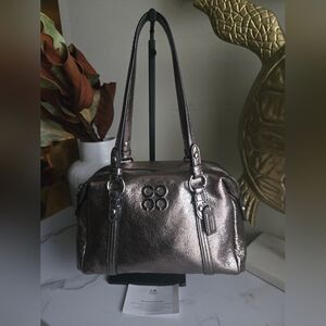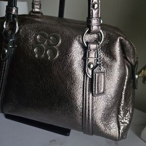 Coach Julia is in like new condition with hangtag and coach care card. Dustbag not included. Top Zip Closure. Mint condition. Only 1 tiny mark on handle absolutely unnoticeable. Beautiful metallic gunmetal color.