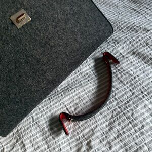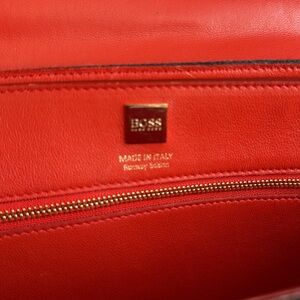 Beautiful grey wool Kelly style bag made in Italy for Hugo Boss. Runway edition! The exterior is complemented by a red leather detail, with a gorgeous red leather interior. Side are two slip pockets and one zipper pocket. There are interchangeable straps, red leather on one side and grey wool on the other, to switch out for handbag or crossbody bag options. A lovely purse that can be dressed up or down; it looks just as great with a suit as it does with jeans!