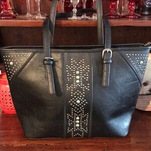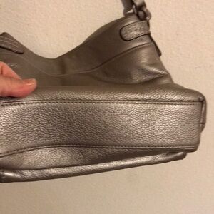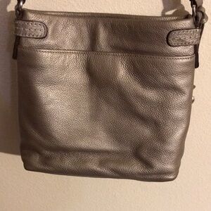 Elegant gray crossbody bag with studded accents. Features adjustable strap and signature charm. Preowned Good, Good Condition