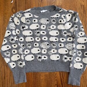 This is a super cute THML sweater. It is slightly cropped, gray with white sheep. The shoulders have slight pleating at the seam. The sweater is made of a polyester, viscose and nylon blend. It is a size XS.