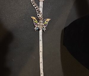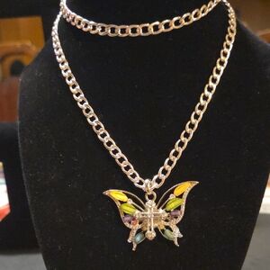 Elegant butterfly pendant necklace featuring a silver-tone cuban chain. Perfect for adding a touch of color and sophistication to any outfit.